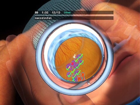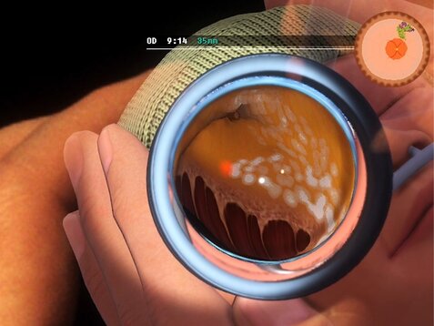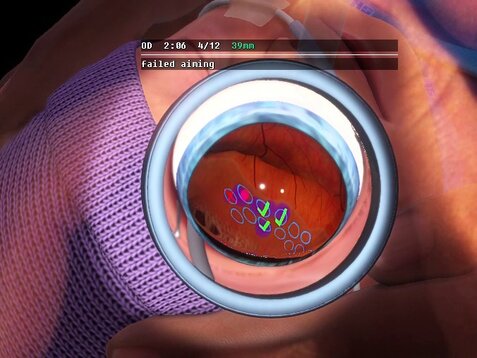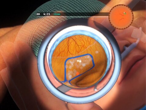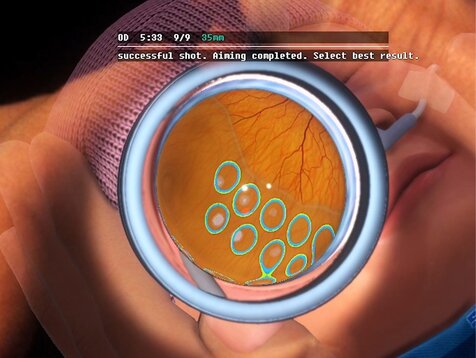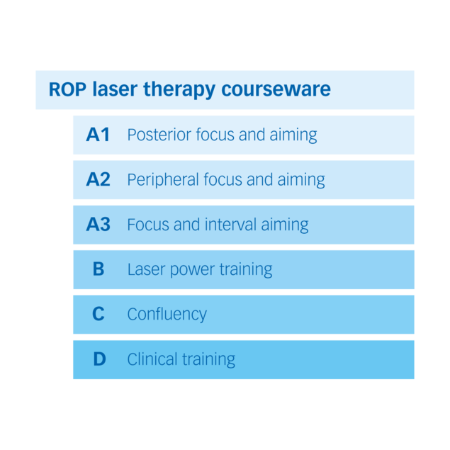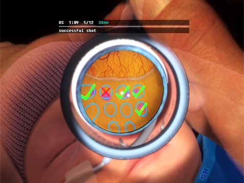 En utilisant les cibles laser devenues familières, les étudiants s’entraînent à régler la bonne puissance du laser et la bonne durée d'impulsion en évaluant l’apparence des brûlures laser qu'ils effectuent. Dans l’idéal, les brûlures laser doivent être grises, ce qui est le signe d'un réglage optimal du laser. De plus, les apprenants apprennent que les réglages nécessaires dépendent de divers facteurs tels que la sensibilité rétinienne individuelle du patient, la zone rétinienne actuelle, la mise au point du laser ou la distance de travail.